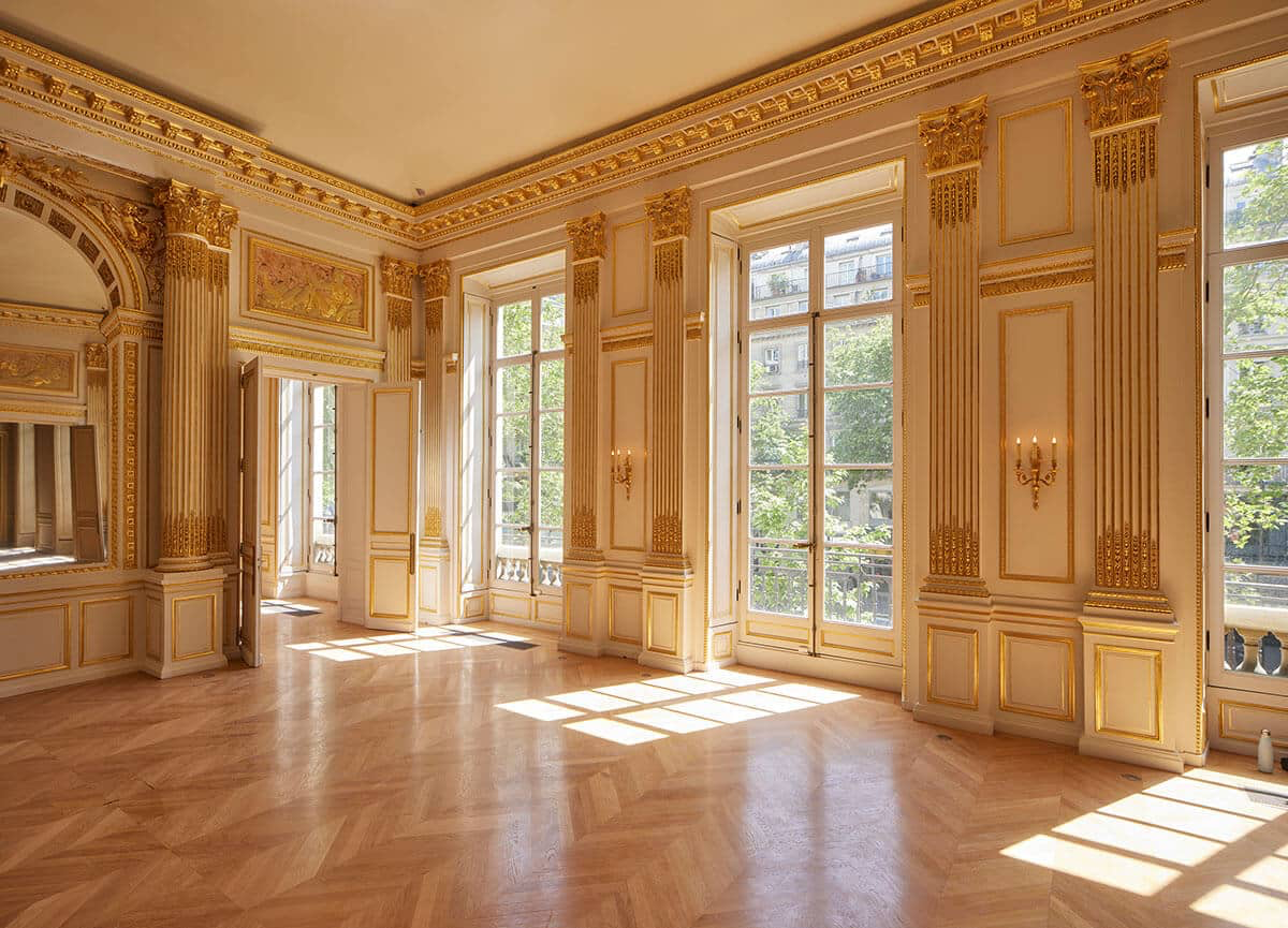L’exposition se déroulait en effet au sein de l’hôtel de Mercy-Argenteau, l’un des sites permanents de l’École des Arts Joailliers. Situé boulevard Montmartre, dans le IXème arrondissement de Paris, cet hôtel particulier est l’une des plus anciennes demeures privées construites sur les Grands Boulevards et l’une des rares à avoir été conservée. À ce titre, il est inscrit à l’inventaire des immeubles remarquables de la Ville de Paris. Édifié en 1778 par un jeune architecte en vogue, Firmin Perlin, l’hôtel ne doit son nom non pas à son propriétaire, Jean-Joseph de Laborde, grand banquier et spéculateur, mais à son premier occupant, qui en obtint l’usufruit : le comte Florimond-Claude de Mercy-Argenteau, ambassadeur de Marie-Thérèse d’Autriche. Si l’hôtel a subi d’importantes transformations au fil des ans, on peut encore admirer de nos jours certains éléments d’époque Louis XVI ; citons par exemple l’escalier d’honneur orné de vases antiques et éclairé d’un lanterneau vitré, ou le salon d’apparat rythmé de portiques corinthiens et agrémenté de boiseries dorées sur fond blanc. L’aménagement intérieur et extérieur de l’hôtel est caractéristique du goût néoclassique, et illustre une tendance de l’époque où la demeure privée tend à devenir un monument public et visible.