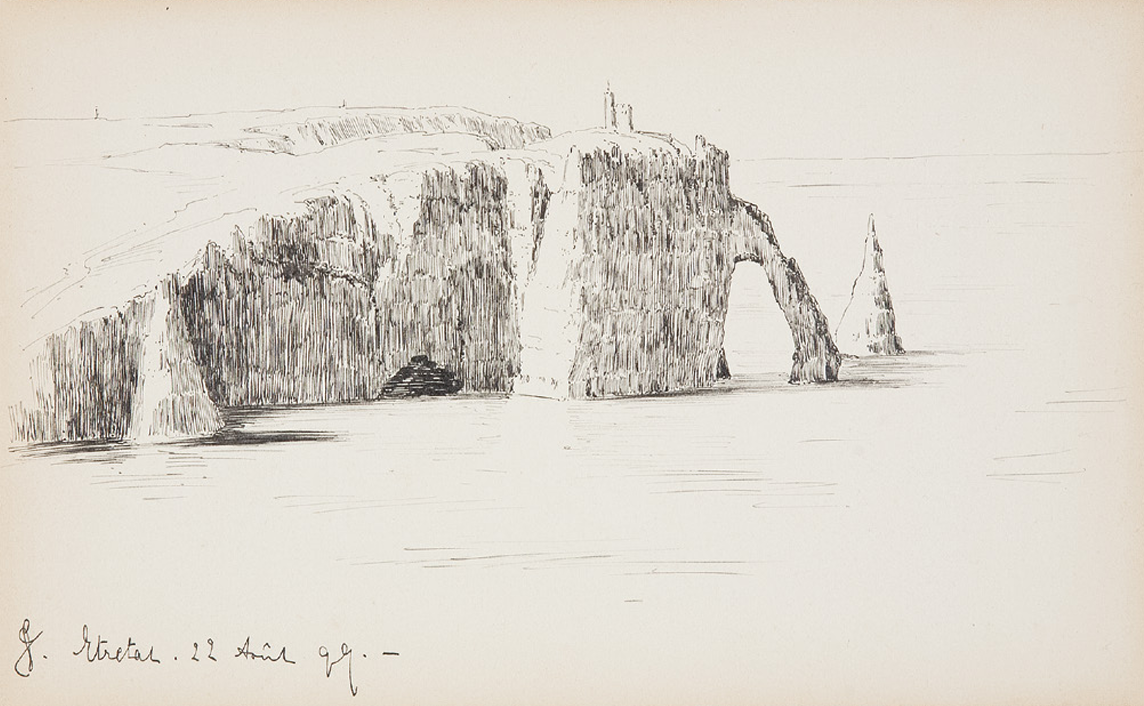 Finalement, l’exposition nous permet comme promis de nous questionner sur le processus de création d’un mythe, celui d’Étretat. Alors que le site connaît déjà dans la seconde moitié du XIXe siècle un tourisme florissant, ses représentations témoignent d’une vision qui cherche encore à préserver une certaine authenticité : celle d’une nature sauvage et de scènes populaires colorées d’un certain folklorisme. Images fantasmées et attrayantes, diffusées par les toiles, les tirages photographiques et les cartes postales, les vues d’Étretat, de ses falaises et « par-delà », nous rappellent que les mythes ne sont pas seulement portés par la voix, mais peuvent encore l’être par la main et l’oeil des artistes.